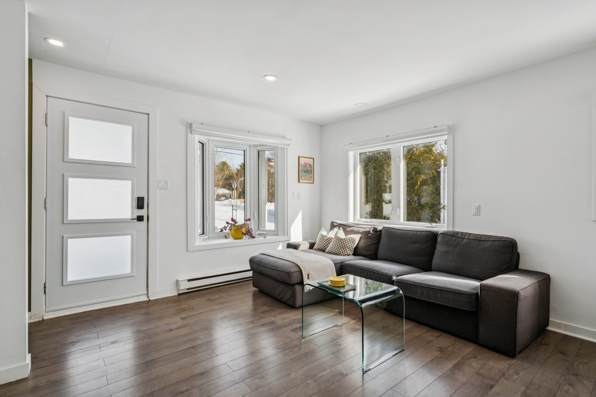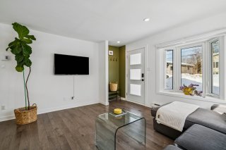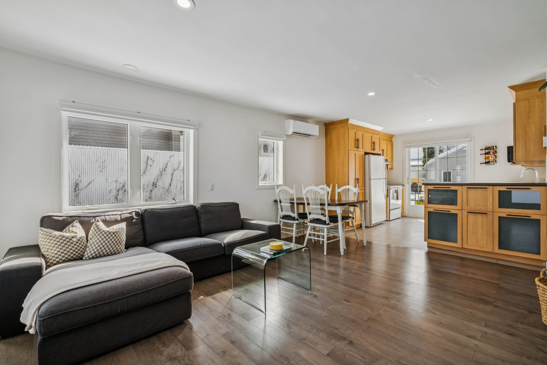 Air Commune: Magnifique aire commune très lumineuse, offrant un bel espace chaleureux et convivial. Le plancher flottant apporte une belle touche de chaleur à l'espace.