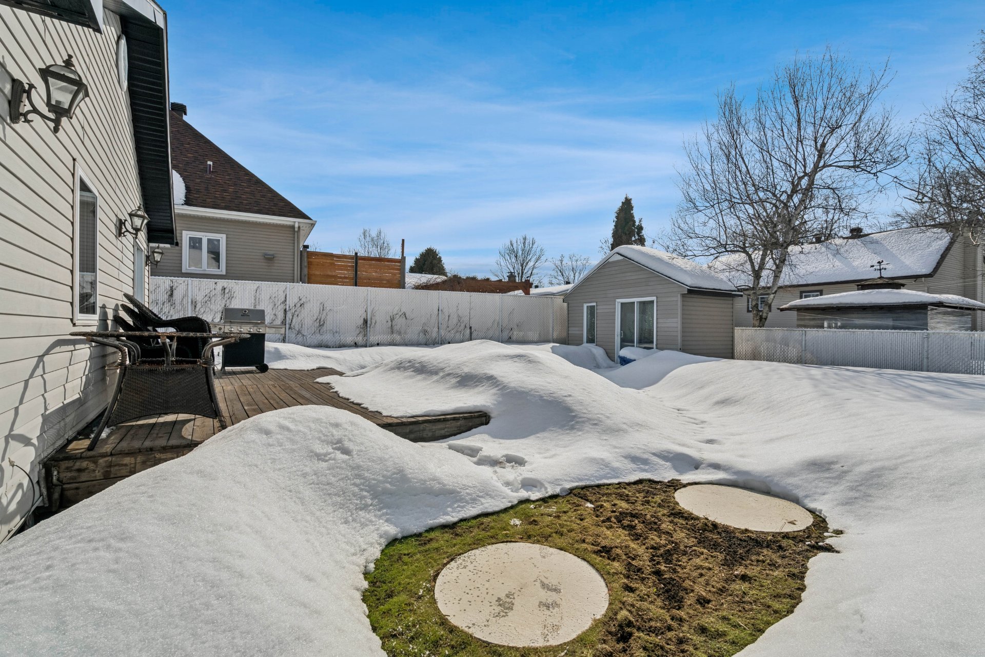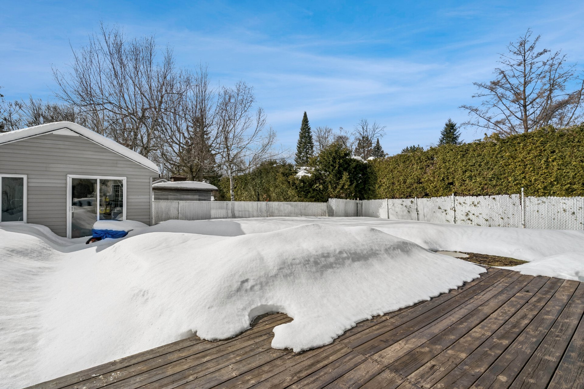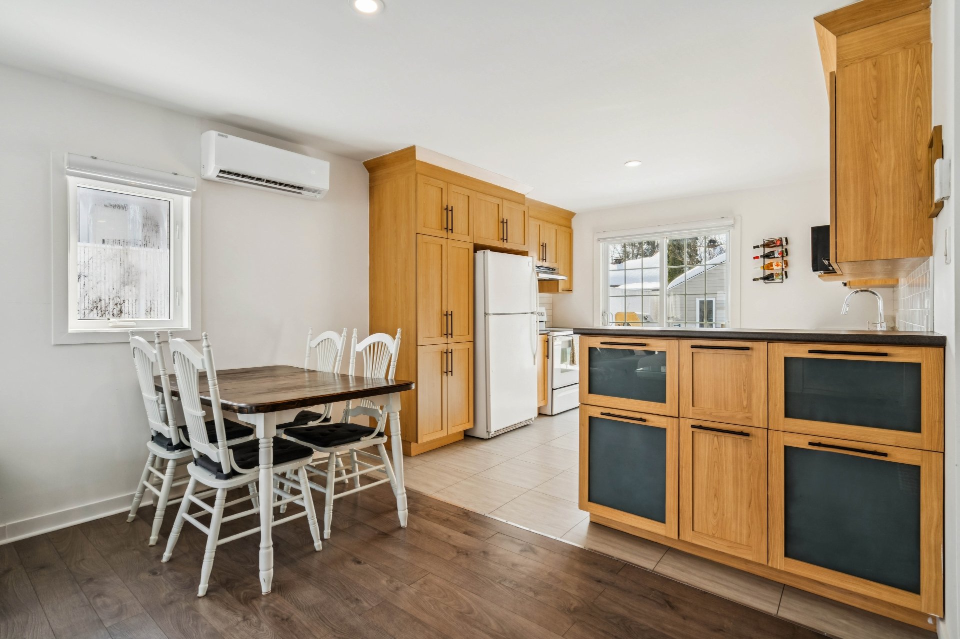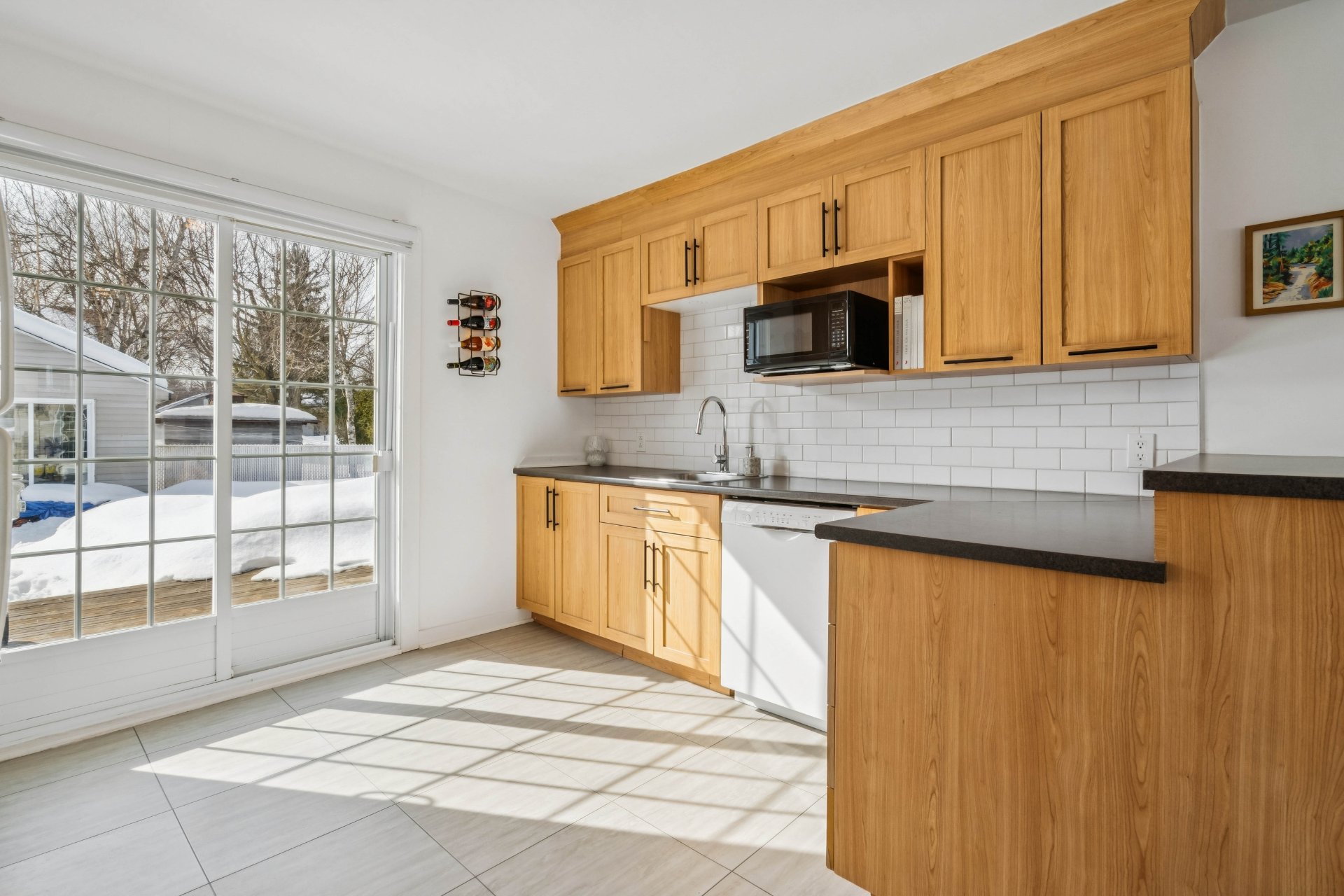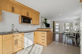 Cuisine : Belle espace de rangement fonctionnelle. Cuisine bien pensée avec de beaux espaces de travail. Les armoires effet bois apportent un style intemporel et chaleureux, tandis que le dosseret blanc ajoute une touche plus moderne. La grande porte patio apporte une belle luminosité.