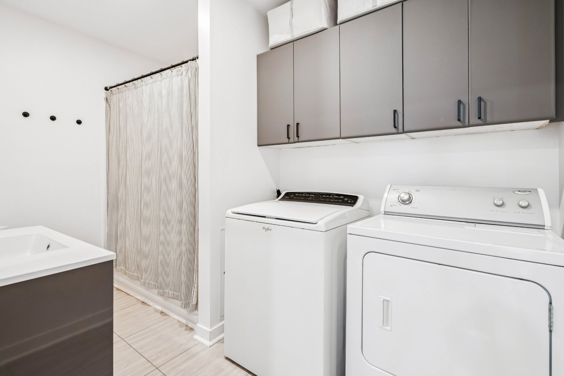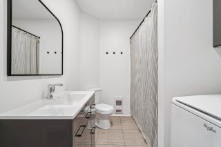 Salle de bain : Plancher de céramique. Vanité de belle dimension offrant un bel espace de rangement pratique. Espace laveuse et sécheuse.